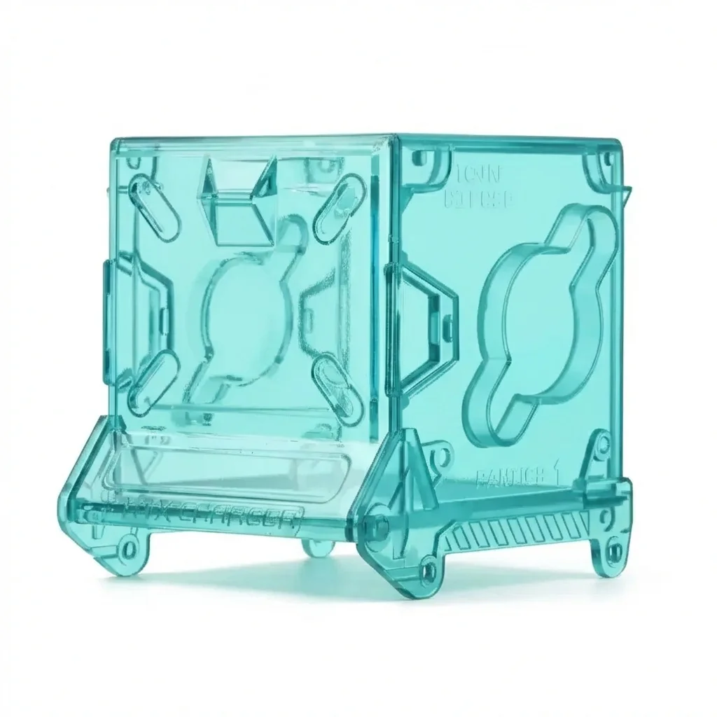 Transparent teal blue box charger and 2 storage carts. Carts can stack above and below a 4cm BeastBox in cube mode to allow the BeastBox to fit snuggly within the box charger.