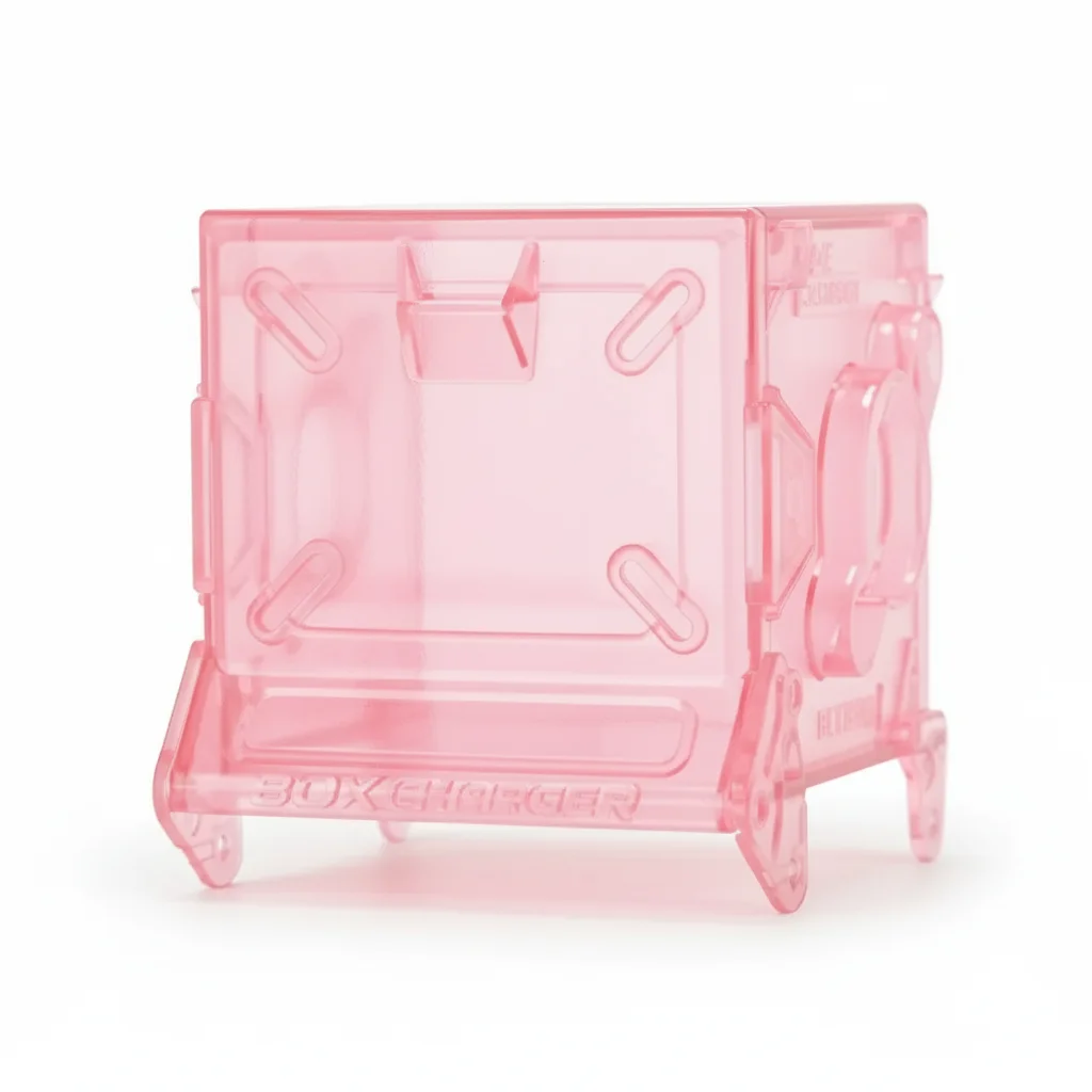 Transparent pink box charger and 2 storage carts. Carts can stack above and below a 4cm BeastBox in cube mode to allow the BeastBox to fit snuggly within the box charger.