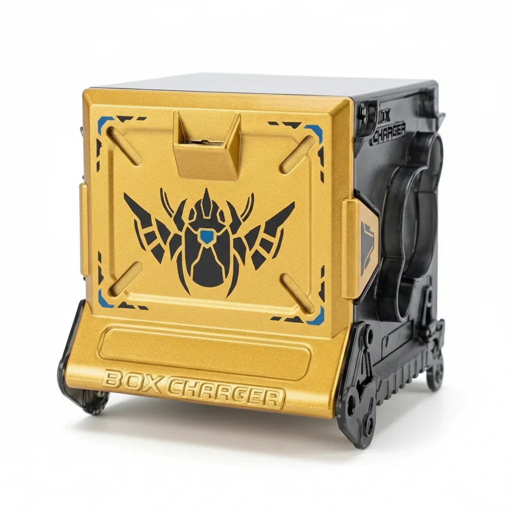 A black BeastBox box charger with a gold door, featuring a black beetle graphic with blue accents.