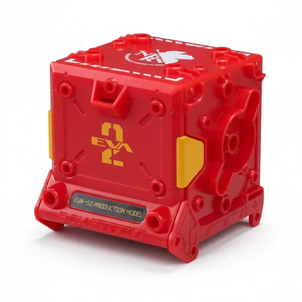 A red BeastBox box charger featuring a graphic of the NERV logo on the top of the box, and the text "EVA-02 Production Mode" on the front, as well as orange accents. Packaged with limited edition EVA-02.