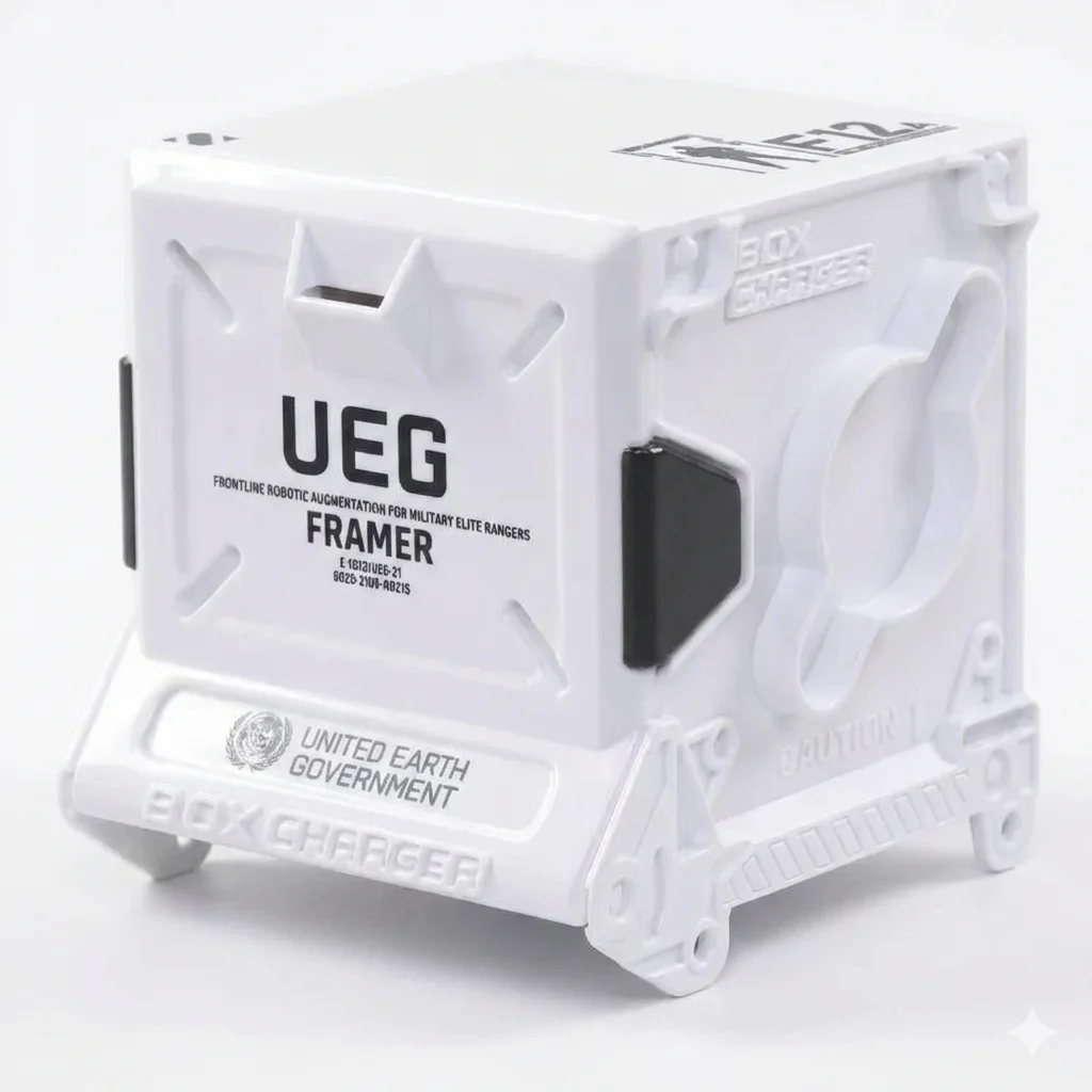 A white BeastBox box charger with Wandering Earth United Earth Government decos and black tabs. Packaged with Framer.